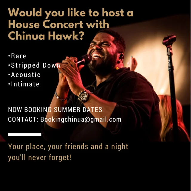 A house concert is exactly what it sounds like; you, your friends, live music, food, drinks, and conversation. The environment is meant to be cozy and intimate, allowing you and your guests to really connect with Chinua Hawk.